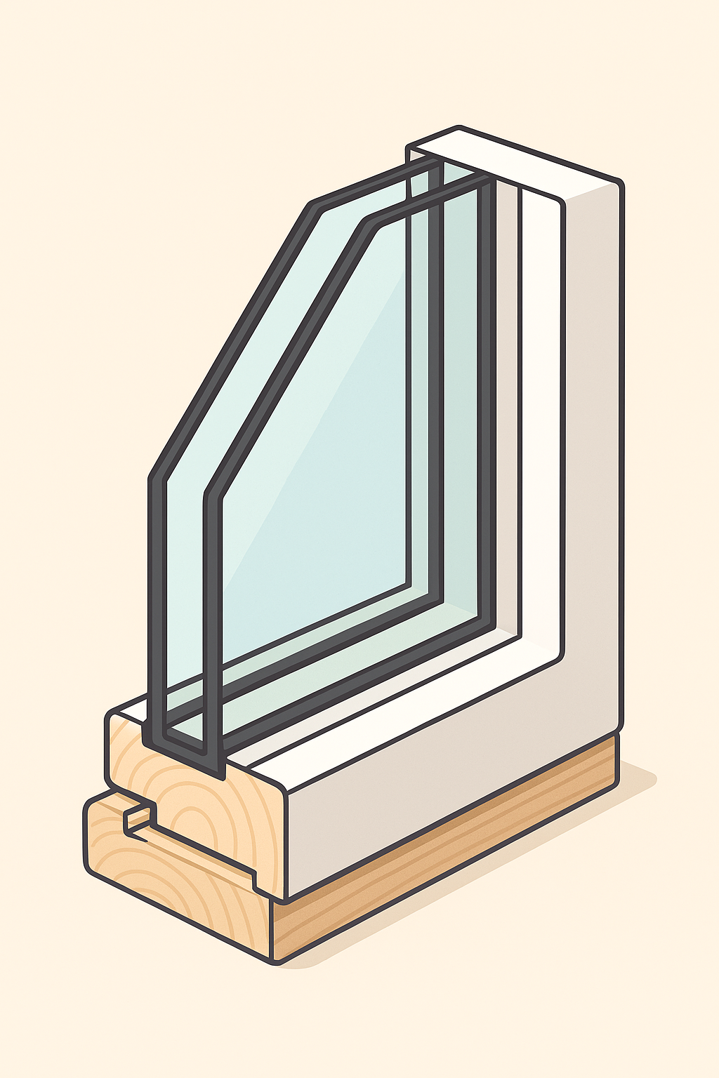 Vindus kvaliteten er toppen av markedet. Vinduer etter fasade tegninger, 3 stk. 2-lags vinduer. U-verdi = 1,2 W/m²K. Farger følger bygget