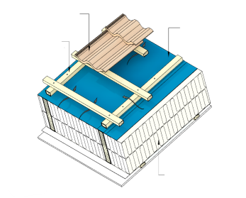 Over tekkingen monteres 30×48 mm sløyfer og 30×48 mm lekter, som gir nødvendig lufting under taksteinen og sørger for god drenering av eventuelt kondensvann. Takstein legges deretter på lektene som avsluttende og beskyttende overflate.